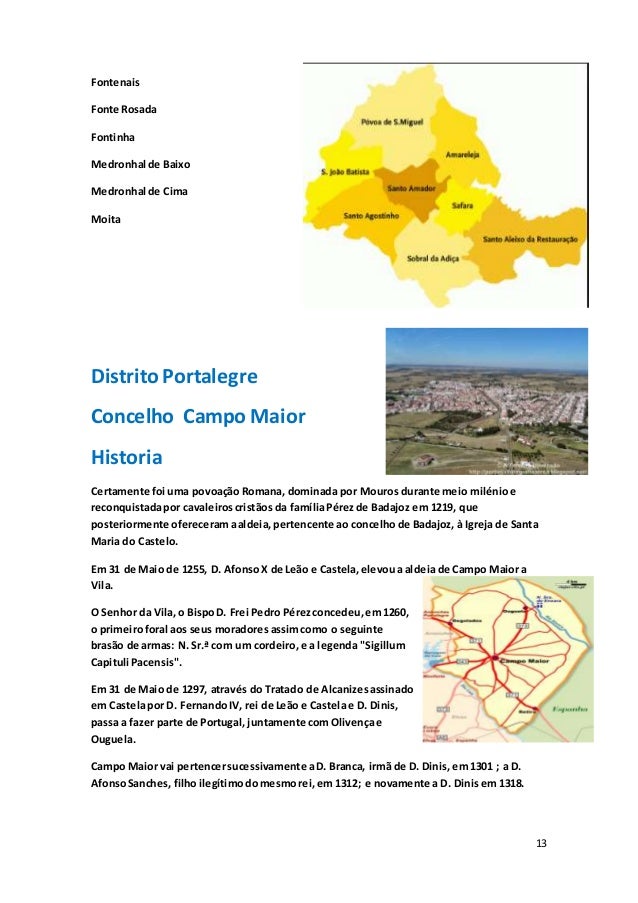 13. 13. 13 Fontenais Fonte Rosada Fontinha Medronhal de Baixo Medronhal de Cima Moita Distrito Portalegre Concelho Campo Maior Historia Certamente foi uma povoação Romana, dominada por Mouros durante meio milénioe reconquistadapor cavaleiroscristãos da famíliaPérezde Badajoz em 1219, que posteriormente ofereceramaaldeia,pertencente ao concelhode Badajoz, à Igreja de Santa Maria do Castelo. Em 31 de Maio de 1255, D. AfonsoX de Leão e Castela,elevoua aldeia de Campo Maior a Vila. O Senhor da Vila,o BispoD. Frei Pedro Pérezconcedeu,em1260, o primeiroforal aos seus moradores assimcomo o seguinte brasão de armas: N. Sr.ª com um cordeiro,e a legenda"Sigillum Capituli Pacensis". Em 31 de Maio de 1297, através do Tratado de Alcanizesassinado em Castelapor D. FernandoIV, rei de Leão e Castelae D. Dinis, passa a fazer parte de Portugal, juntamente com Olivençae Ouguela. Campo Maior vai pertencersucessivamente aD. Branca, irmã de D. Dinis, em1301 ; a D. AfonsoSanches, filhoilegítimodomesmorei,em 1312; e novamente a D. Dinisem 1318.