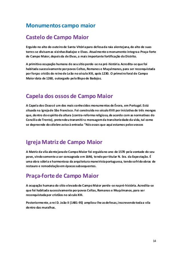 14. 14. 14 Monumentos campo maior Castelo de Campo Maior Erguido no alto do outeirode Santa Vitóriapara defesada raia alentejana,do alto de suas torres se divisamas vizinhasBadajoz e Elvas. Atualmente omonumento integraa Praça-forte de Campo Maior,depoisda de Elvas, a mais importante fortificação do Distrito. A primitiva ocupação humana do seusítioperde-se na pré-história.Acredita-se que foi habitada sucessivamente porpovos Celtas,Romanos e Muçulmanos,para ser reconquistada por forças cristãs do reinode Leão no séculoXIII, após 1230. O primeiroforal de Campo Maior data de 1260, outorgado peloBispode Badajoz. Capela dos ossos de Campo Maior A Capela dos Ossosé um dos mais conhecidosmonumentosde Évora, em Portugal.Está situada na Igrejade São Francisco. Foi construída no séculoXVII por iniciativade três monges que,dentro do espíritoda altura (contra-reformareligiosa,de acordo com as normativas do Concíliode Trento), pretendeutransmitira mensagemda transitoriedade da vida, tal como se depreende docélebre avisoà entrada: "Nósossos que aqui estamos pelosvossos Igreja Matriz de Campo Maior A Matriz da vilaalentejanade Campo Maior foi erguidano ano de 1570 pela vontade do seu povo, vindosomente a ser consagrada em 1646, tendopor titular N. Sra. da Expectação. É uma obra sóbria e harmoniosa da arquitetura maneiristaportuguesa, tendosofridoobras de restauro e remodelaçãoem épocassubsequentes. Praça-forte de Campo Maior A ocupação humana do sítio elevadode Campo Maior perde-se napré-história.Acredita-se que foi habitada sucessivamente porpovos Celtas,Romanos e Muçulmanos,para ser reconquistadapor cristãos no séculoXIII. Posteriormente,orei D. João II (1481-95) ampliou-lhe asdefesas,inscrevendotodaa vila dentro das muralhas.