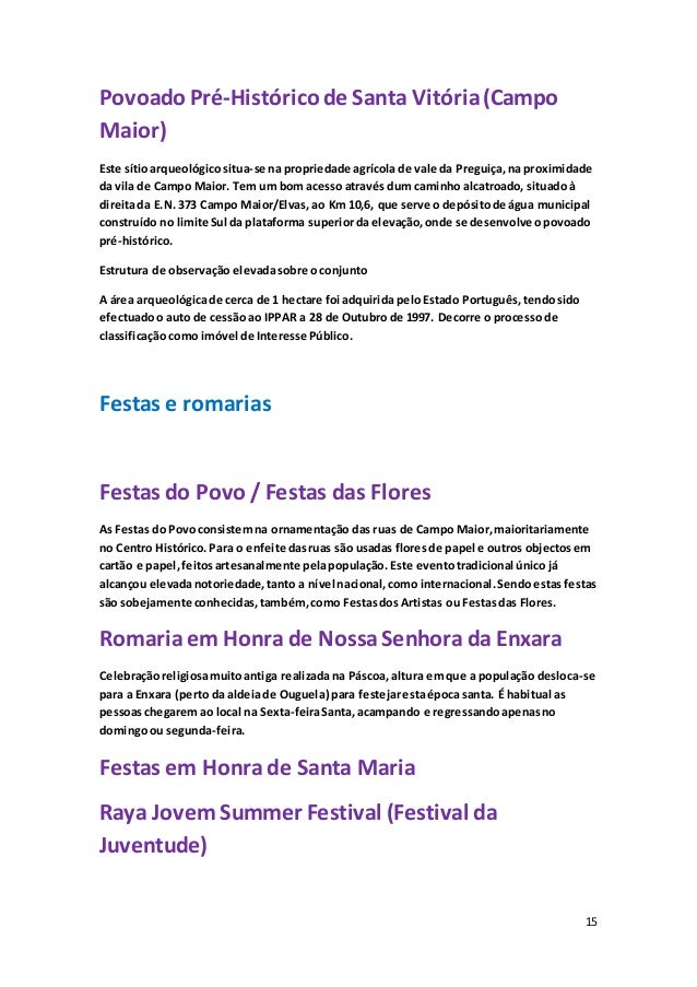 15. 15. 15 Povoado Pré-Histórico de Santa Vitória(Campo Maior) Este sítioarqueológicositua-se na propriedade agrícola de vale da Preguiça,na proximidade da vila de Campo Maior. Tem um bom acesso através dum caminho alcatroado, situado à direitada E.N. 373 Campo Maior/Elvas, ao Km 10,6, que serve o depósitode água municipal construído no limite Sul da plataforma superiorda elevação,onde se desenvolve opovoado pré-histórico. Estrutura de observação elevadasobre o conjunto A área arqueológicade cerca de 1 hectare foi adquirida peloEstado Português,tendosido efectuadoo auto de cessão ao IPPAR a 28 de Outubro de 1997. Decorre o processo de classificação como imóvel de Interesse Público. Festas e romarias Festas do Povo / Festas das Flores As Festas do Povoconsistemna ornamentação das ruas de Campo Maior,maioritariamente no Centro Histórico. Para o enfeite dasruas são usadas floresde papel e outros objectosem cartão e papel,feitosartesanalmente pelapopulação. Este eventotradicional único já alcançou elevadanotoriedade,tanto a nível nacional,como internacional.Sendoestas festas são sobejamente conhecidas,também,como Festasdos Artistas ou Festasdas Flores. Romariaem Honra de NossaSenhora da Enxara Celebraçãoreligiosamuitoantiga realizadana Páscoa, altura emque a população desloca-se para a Enxara (perto da aldeiade Ouguela) para festejarestaépoca santa. É habitual as pessoaschegarem ao local na Sexta-feiraSanta, acampando e regressandoapenasno domingoou segunda-feira. Festas em Honra de Santa Maria Raya Jovem Summer Festival (Festival da Juventude)