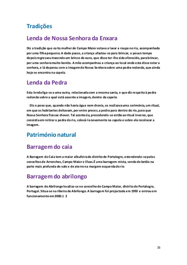 16. 16. 16 Tradições Lenda de Nossa Senhorada Enxara Diz a tradição que certa mulherde Campo Maior estava a lavar a roupa no rio, acompanhada por uma filhapequena.A dado passo, a criança afastou-se para brincar, e pouco tempo depoisregressoutrazendoum brinco de ouro, que disse ter-lhe sidooferecido,parabrincar, por uma senhoramuito bonita. A mãe acompanhou a criança ao local onde esta disse estar a senhora,e lá deparou com a imagemde Nossa Senhorasobre uma pedra redonda, que ainda hoje se encontra na capela. Lenda da Pedra Esta lendaliga-se a uma outra, relacionadacom a mesma santa, e que diz respeitoà pedra redonda sobre a qual está assente a imagem,dentro da capela: Diz o povo que, quando não havia água nemchovia, se realizavauma cerimónia,um ritual, em que os habitantes deitavam,por entre preces,a pedra para dentro do rio,para que Nossa Senhora fizesse chover.Tal acontecia,precedendo-se entãoaoritual inverso,que consistiaem retirar a pedra do rio, colocá-lanovamente na capela e sobre elarecolocar a imagem. Património natural Barragem do caia A Barragem do Caia tem a maior albufeirado distritode Portalegre,estendendo-sepelos concelhosde Arronches,Campo Maior e Elvas.É uma barragem mista, sendode betão na parte mais profunda do vale e de aterro na margem esquerdado rio Barragem do abrilongo A barragem de Abrilongolocaliza-se no concelhode Campo Maior, distrito de Portalegre, Portugal. Situa-se na ribeira de Abrilongo.A barragem foi projectada em 1993 e entrouem funcionamentoem2000.1 2