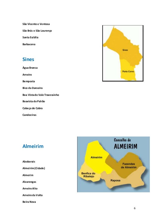 6. 6. 6 São Vicente e Ventosa São Brás e São Lourenço Santa Eulália Barbacena Sines Água Branca Arneiro Bemposta Bico da Daroeira Boa Vistado Vale Travessinho Boavista do Palrão Cabeça de Cabra Candeeiras Almeirim Aboborais Almeirim(Cidade) Almerim Alvarengas ArneiroAlto Arneiroda Volta Beira Nova