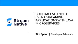 [AI Dev World 2022] Build ML Enhanced Event Streaming 3:00 PM - 3:25 PM PDT [#VIRTUAL] OPEN TALK (AI): BUILD ML ENHANCED EVENT STREAMING APPLICATIONS WITH JAVA MICROSERVICES VIRTUAL ONLY API WORLD & AI DEVWORLD STAGE VIRTUAL ONLY VIRTUAL APPLIED MACHINE LEARNING Timothy Spann Timothy Spann StreamNative, Developer Advocate In this talk we will walk through how to build event streaming applications as functions running in with cloud native messaging via Apache Pulsar that run on near infinite scale in any cloud, docker or K8. We will show you have to deploy ML functions to transform real-time data for IoT, Streaming Analytics and many other use cases. After this talk you will be able to build Java microservices with ease and deploy them anywhere utilizing the open source unified streaming and messaging platform, Apache Pulsar. Finally, we will show you have to add dashboards with Web Sockets, no code data sinks, integrate with Apache NiFi data pipelines, SQL Reports with Apache Spark and finally continuous ETL with Apache Flink. I have built many of these applications for many organizations as part of the FLiPN Stack. Let's build next generation applications today regardless if your data is REST APIs, Sensors, Logs, NoSQL Sources, Events or Database tables. https://aidevworld.com/conference/conference-tracks/applied-machine-learning/ https://github.com/tspannhw/pulsar-transit-function https://github.com/tspannhw/FLiPStackWeekly/blob/main/README.md