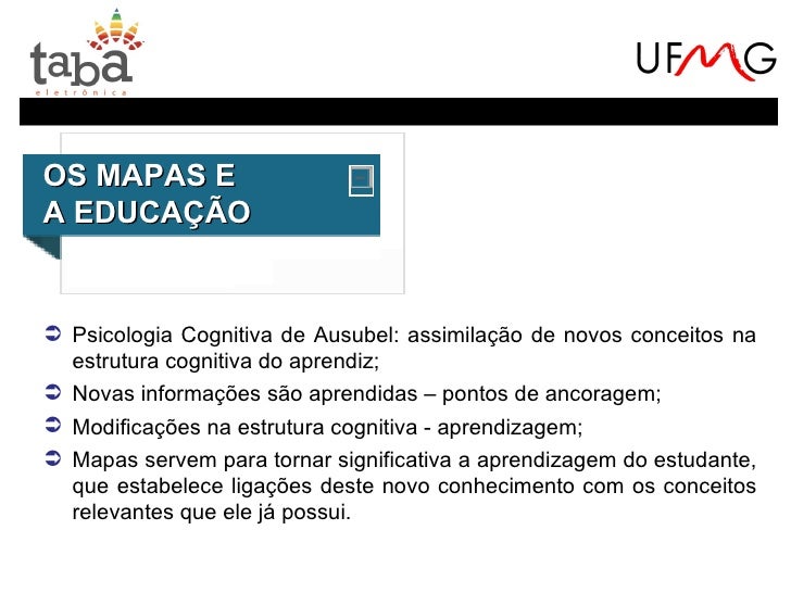8. 8. OS MAPAS EA EDUCAÇÃO Psicologia Cognitiva de Ausubel: assimilação de novos conceitos na estrutura cognitiva do aprendiz; Novas informações são aprendidas – pontos de ancoragem; Modificações na estrutura cognitiva - aprendizagem; Mapas servem para tornar significativa a aprendizagem do estudante, que estabelece ligações deste novo conhecimento com os conceitos relevantes que ele já possui.