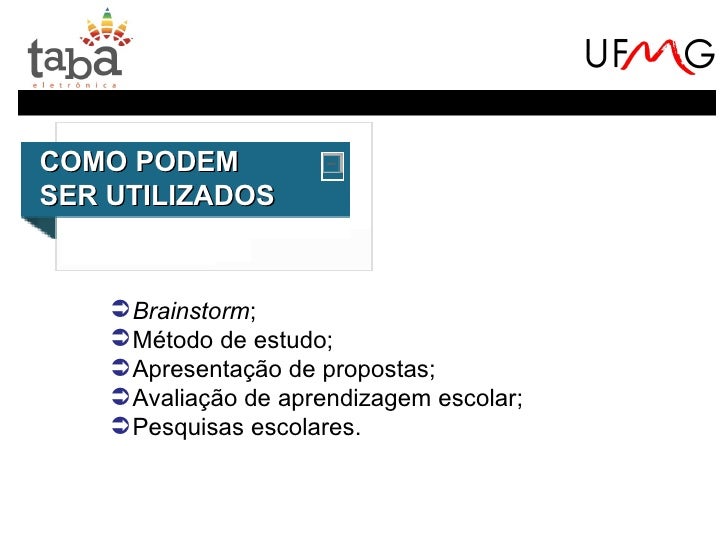 9. 9. COMO PODEMSER UTILIZADOS Brainstorm; Método de estudo; Apresentação de propostas; Avaliação de aprendizagem escolar; Pesquisas escolares.