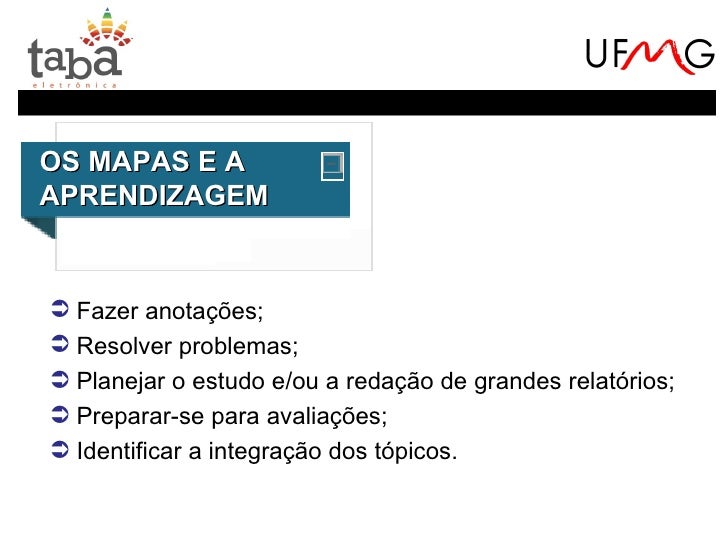 10. 10. OS MAPAS E AAPRENDIZAGEM Fazer anotações; Resolver problemas; Planejar o estudo e/ou a redação de grandes relatórios; Preparar-se para avaliações; Identificar a integração dos tópicos.