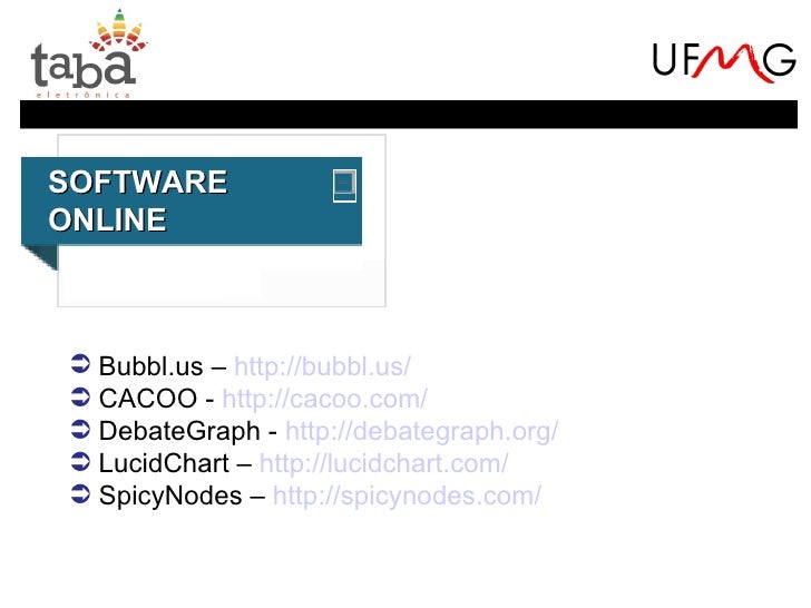 13. 13. SOFTWAREONLINE Bubbl.us – http://bubbl.us/ CACOO - http://cacoo.com/ DebateGraph - http://debategraph.org/ LucidChart – http://lucidchart.com/ SpicyNodes – http://spicynodes.com/