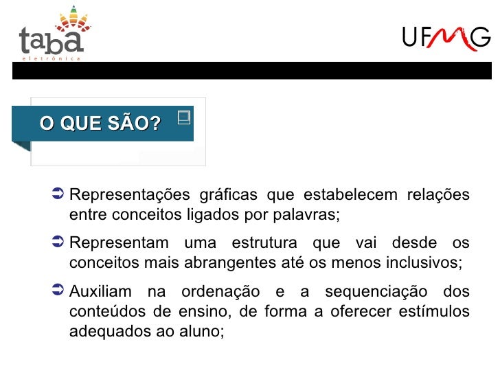 2. 2. O QUE SÃO? Representações gráficas que estabelecem relações entre conceitos ligados por palavras; Representam uma estrutura que vai desde os conceitos mais abrangentes até os menos inclusivos; Auxiliam na ordenação e a sequenciação dos conteúdos de ensino, de forma a oferecer estímulos adequados ao aluno;