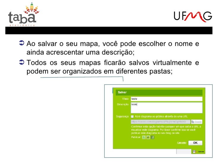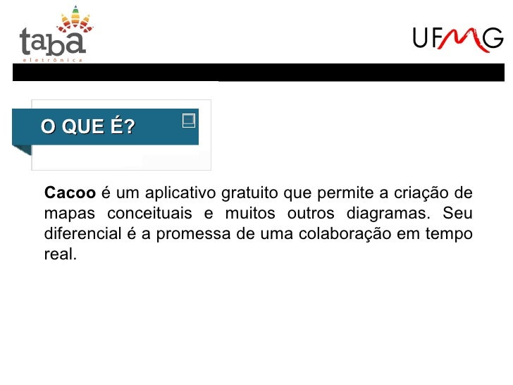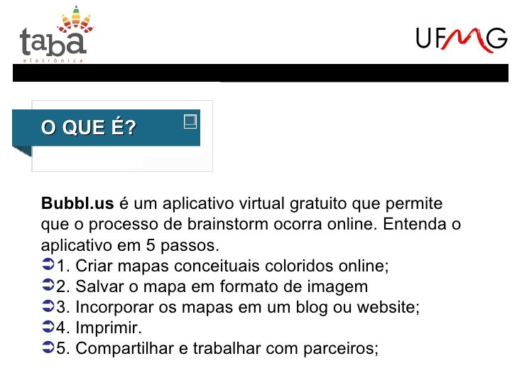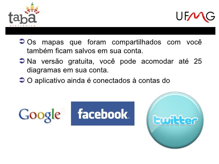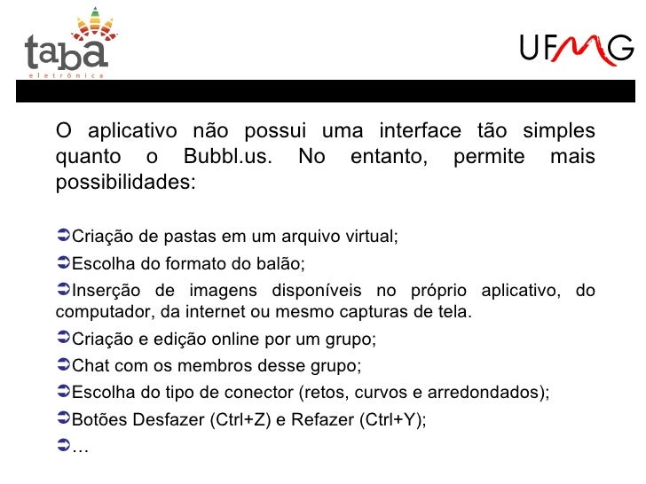 24. 24. O aplicativo não possui uma interface tão simplesquanto o Bubbl.us. No entanto, permite maispossibilidades:Criação de pastas em um arquivo virtual;Escolha do formato do balão;Inserção de imagens disponíveis no próprio aplicativo, docomputador, da internet ou mesmo capturas de tela.Criação e edição online por um grupo;Chat com os membros desse grupo;Escolha do tipo de conector (retos, curvos e arredondados);Botões Desfazer (Ctrl+Z) e Refazer (Ctrl+Y);…