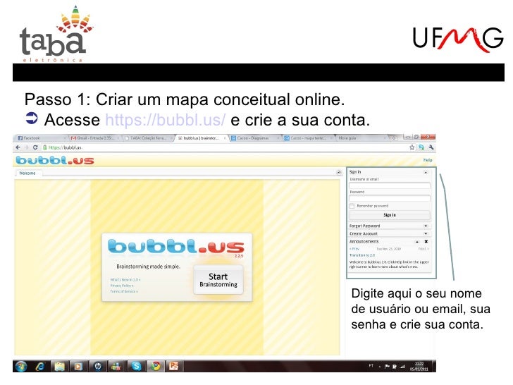 15. 15. Passo 1: Criar um mapa conceitual online. Acesse https://bubbl.us/ e crie a sua conta. Digite aqui o seu nome de usuário ou email, sua senha e crie sua conta.