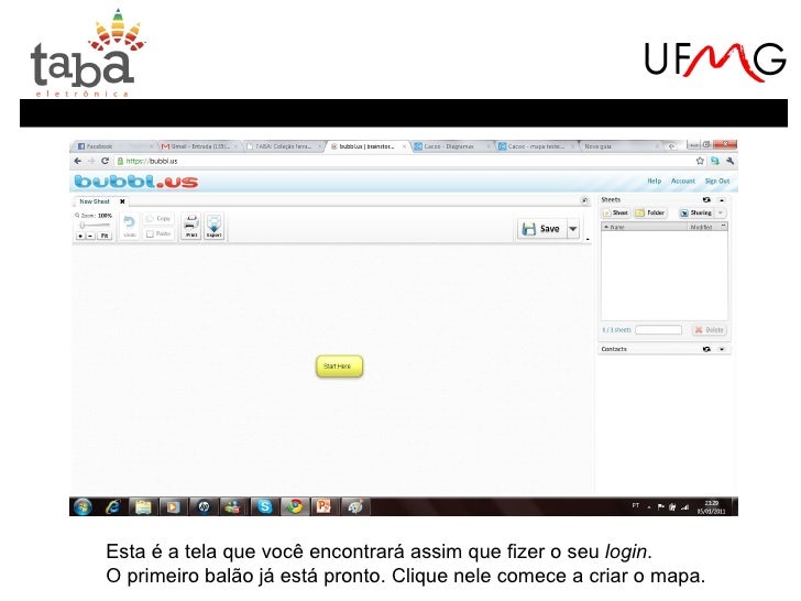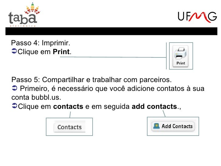 19. 19. Passo 4: Imprimir.Clique em Print.Passo 5: Compartilhar e trabalhar com parceiros. Primeiro, é necessário que você adicione contatos à suaconta bubbl.us.Clique em contacts e em seguida add contacts.,