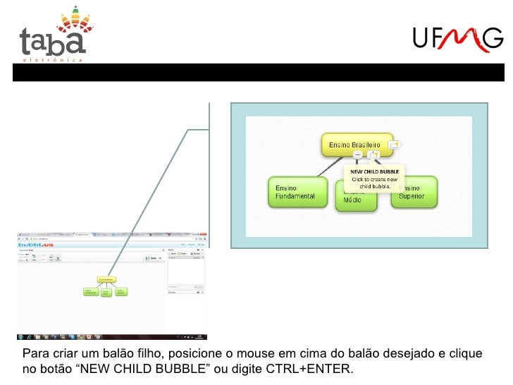 17. 17. Para criar um balão filho, posicione o mouse em cima do balão desejado e cliqueno botão “NEW CHILD BUBBLE” ou digite CTRL+ENTER.