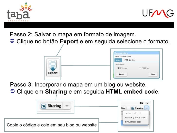 18. 18. Passo 2: Salvar o mapa em formato de imagem.  Clique no botão Export e em seguida selecione o formato. Passo 3: Incorporar o mapa em um blog ou website.  Clique em Sharing e em seguida HTML embed code.Copie o código e cole em seu blog ou website
