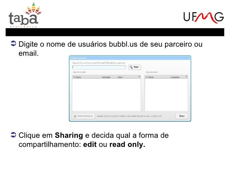 20. 20.  Digite o nome de usuários bubbl.us de seu parceiro ou email. Clique em Sharing e decida qual a forma de compartilhamento: edit ou read only.