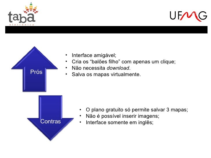 21. 21. • Interface amigável;• Cria os “balões filho” com apenas um clique;• Não necessita download.• Salva os mapas virtualmente. • O plano gratuito só permite salvar 3 mapas; • Não é possível inserir imagens; • Interface somente em inglês;