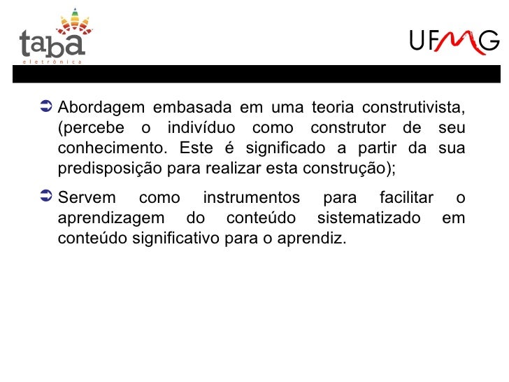 3. 3.  Abordagem embasada em uma teoria construtivista, (percebe o indivíduo como construtor de seu conhecimento. Este é significado a partir da sua predisposição para realizar esta construção); Servem como instrumentos para facilitar o aprendizagem do conteúdo sistematizado em conteúdo significativo para o aprendiz.