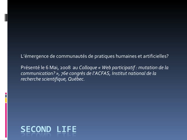 Second life: émergence de communautés de pratiques humaines et artificielles? by alx_bal3,048 views