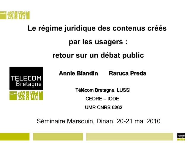 Le régime juridique des contenus créés par les usagers : retour sur un debat public - Annie Blandin et Raruca Preda by marsouin2,516 views