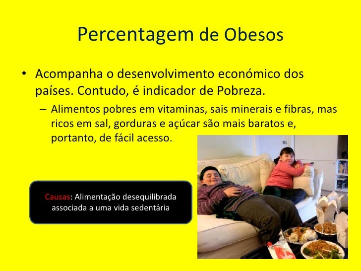 15. 15. Percentagem de Obesos<br />Acompanha o desenvolvimento económico dos países. Contudo, é indicador de Pobreza.<br />Alimentos pobres em vitaminas, sais minerais e fibras, mas ricos em sal, gorduras e açúcar são mais baratos e, portanto, de fácil acesso.<br />Causas: Alimentação desequilibrada associada a uma vida sedentária<br />