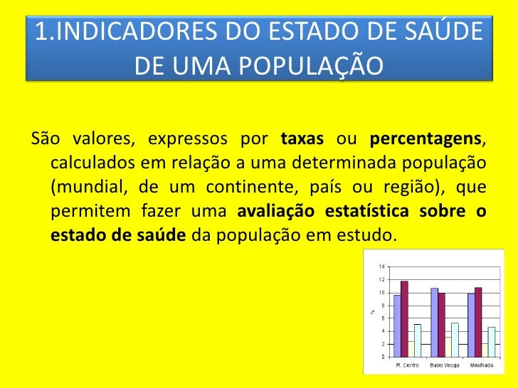 4. 4. 1.INDICADORES DO ESTADO DE SAÚDE DE UMA POPULAÇÃO<br />São valores, expressos por taxas ou percentagens, calculados em relação a uma determinada população (mundial, de um continente, país ou região), que permitem fazer uma avaliação estatística sobre o estado de saúde da população em estudo.<br />