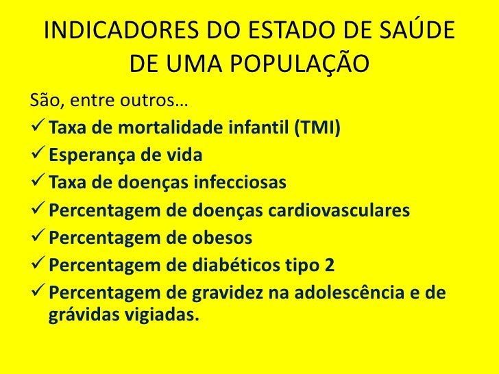 INDICADORES DO ESTADO DE SAÚDE DE UMA POPULAÇÃO<br />São, entre outros…<br /><ul><li>Taxa de mortalidade infantil (TMI)