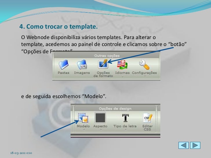 10. 10. 4. Como trocar o template. O Webnode disponibiliza vários templates. Para alterar o template, acedemos ao painel de controle e clicamos sobre o “botão” “Opções de Formato” e de seguida escolhemos “Modelo”.18-03-2011 0:10