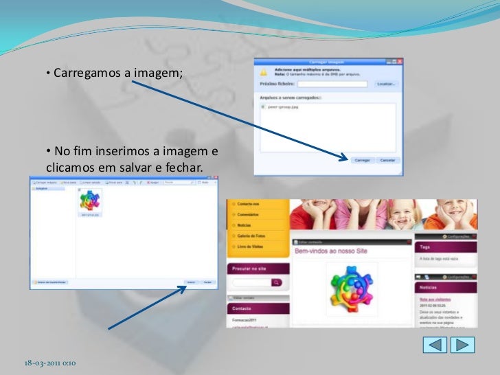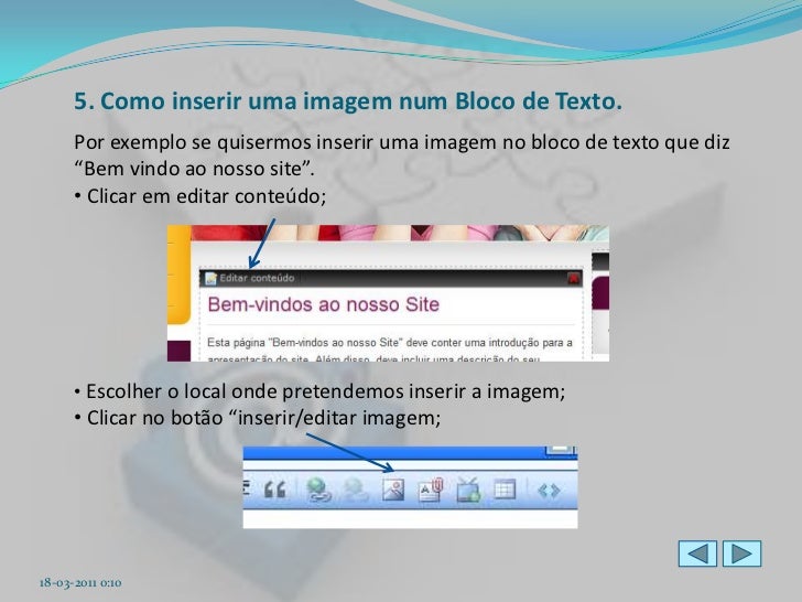 11. 11. 5. Como inserir uma imagem num Bloco de Texto. Por exemplo se quisermos inserir uma imagem no bloco de texto que diz “Bem vindo ao nosso site”. • Clicar em editar conteúdo; • Escolher o local onde pretendemos inserir a imagem; • Clicar no botão “inserir/editar imagem;18-03-2011 0:10
