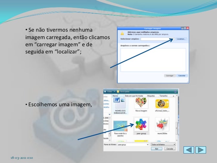 12. 12. • Se não tivermos nenhuma imagem carregada, então clicamos em “carregar imagem” e de seguida em “localizar”; • Escolhemos uma imagem,18-03-2011 0:10
