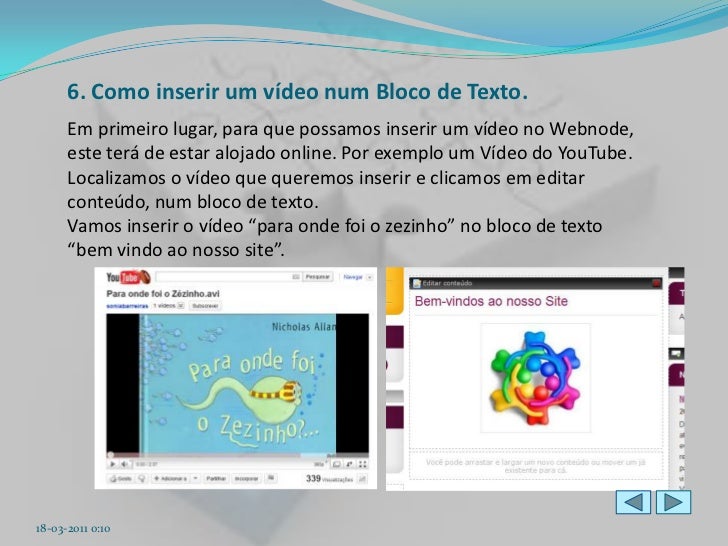 14. 14. 6. Como inserir um vídeo num Bloco de Texto. Em primeiro lugar, para que possamos inserir um vídeo no Webnode, este terá de estar alojado online. Por exemplo um Vídeo do YouTube. Localizamos o vídeo que queremos inserir e clicamos em editar conteúdo, num bloco de texto. Vamos inserir o vídeo “para onde foi o zezinho” no bloco de texto “bem vindo ao nosso site”.18-03-2011 0:10