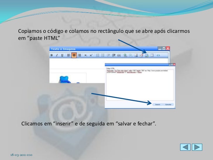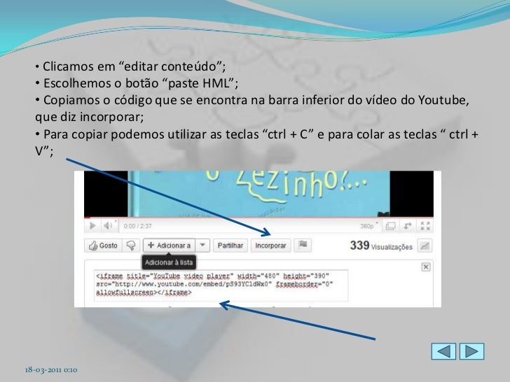 15. 15. • Clicamos em “editar conteúdo”; • Escolhemos o botão “paste HML”; • Copiamos o código que se encontra na barra inferior do vídeo do Youtube, que diz incorporar; • Para copiar podemos utilizar as teclas “ctrl + C” e para colar as teclas “ ctrl + V”;18-03-2011 0:10