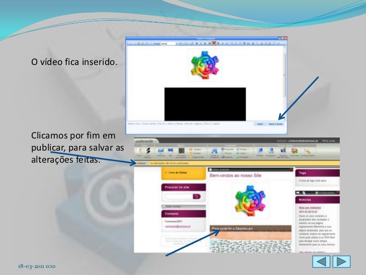 O vídeo fica inserido.     Clicamos por fim em     publicar, para salvar as     alterações feitas.18-03-2011 0:10