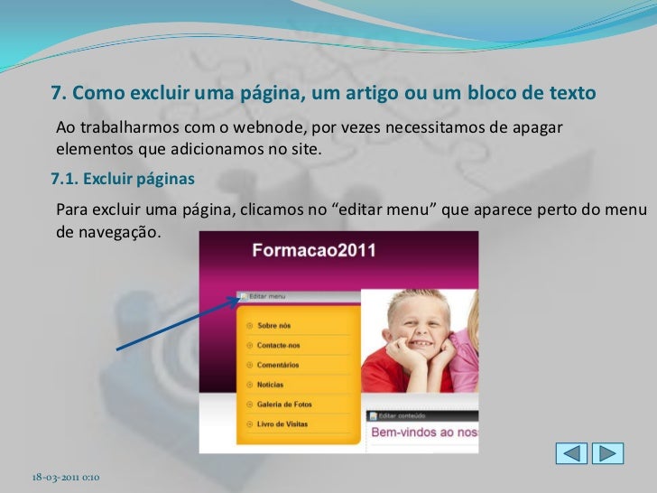 18. 18. 7. Como excluir uma página, um artigo ou um bloco de texto Ao trabalharmos com o webnode, por vezes necessitamos de apagar elementos que adicionamos no site. 7.1. Excluir páginas Para excluir uma página, clicamos no “editar menu” que aparece perto do menu de navegação.18-03-2011 0:10