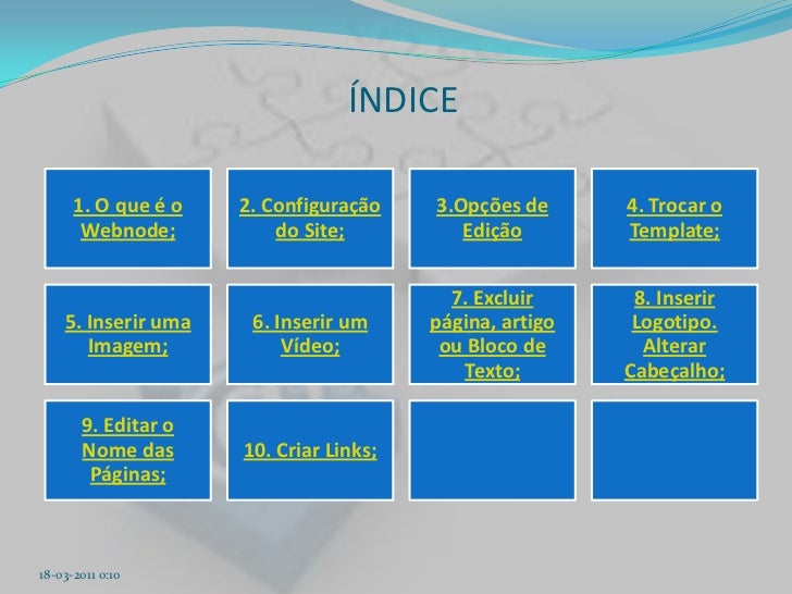 1. 1. ÍNDICE 1. O que é o 2. Configuração 3.Opções de 4. Trocar o Webnode; do Site; Edição Template; 7. Excluir 8. Inserir 5. Inserir uma 6. Inserir um página, artigo Logotipo. Imagem; Vídeo; ou Bloco de Alterar Texto; Cabeçalho; 9. Editar o Nome das 10. Criar Links; Páginas;18-03-2011 0:10