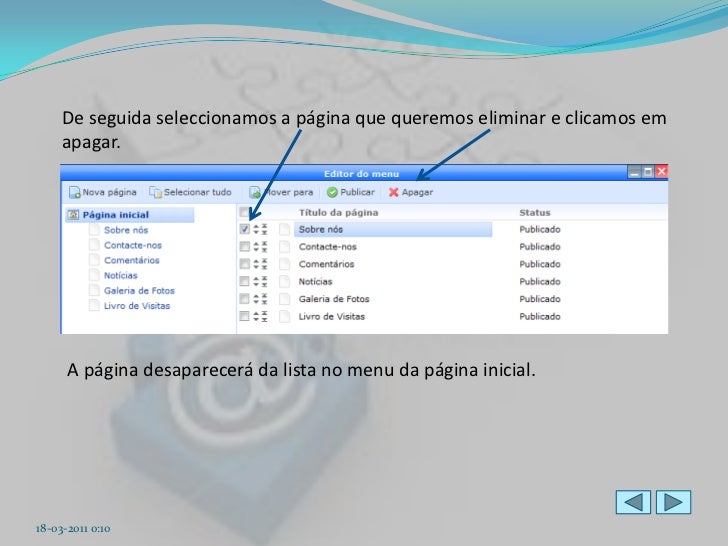 19. 19. De seguida seleccionamos a página que queremos eliminar e clicamos em apagar. A página desaparecerá da lista no menu da página inicial.18-03-2011 0:10