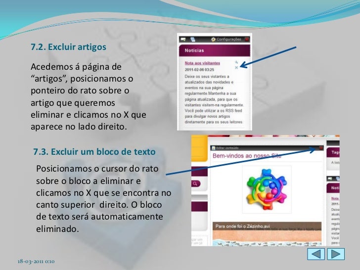 20. 20. 7.2. Excluir artigos Acedemos á página de “artigos”, posicionamos o ponteiro do rato sobre o artigo que queremos eliminar e clicamos no X que aparece no lado direito. 7.3. Excluir um bloco de texto Posicionamos o cursor do rato sobre o bloco a eliminar e clicamos no X que se encontra no canto superior direito. O bloco de texto será automaticamente eliminado.18-03-2011 0:10