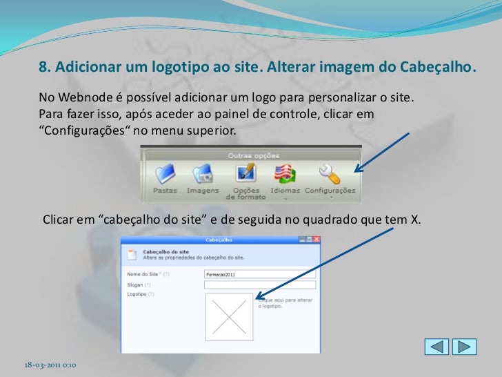21. 21. 8. Adicionar um logotipo ao site. Alterar imagem do Cabeçalho. No Webnode é possível adicionar um logo para personalizar o site. Para fazer isso, após aceder ao painel de controle, clicar em “Configurações“ no menu superior. Clicar em “cabeçalho do site” e de seguida no quadrado que tem X.18-03-2011 0:10