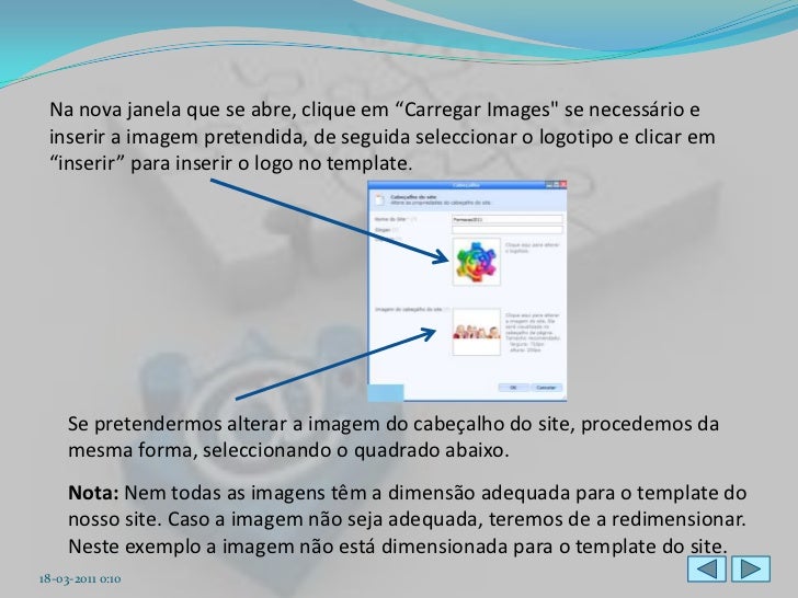 22. 22. Na nova janela que se abre, clique em “Carregar Images" se necessário e inserir a imagem pretendida, de seguida seleccionar o logotipo e clicar em “inserir” para inserir o logo no template. Se pretendermos alterar a imagem do cabeçalho do site, procedemos da mesma forma, seleccionando o quadrado abaixo. Nota: Nem todas as imagens têm a dimensão adequada para o template do nosso site. Caso a imagem não seja adequada, teremos de a redimensionar. Neste exemplo a imagem não está dimensionada para o template do site.18-03-2011 0:10
