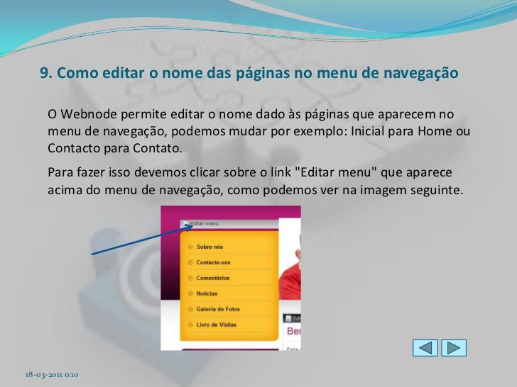 23. 23. 9. Como editar o nome das páginas no menu de navegação O Webnode permite editar o nome dado às páginas que aparecem no menu de navegação, podemos mudar por exemplo: Inicial para Home ou Contacto para Contato. Para fazer isso devemos clicar sobre o link "Editar menu" que aparece acima do menu de navegação, como podemos ver na imagem seguinte.18-03-2011 0:10