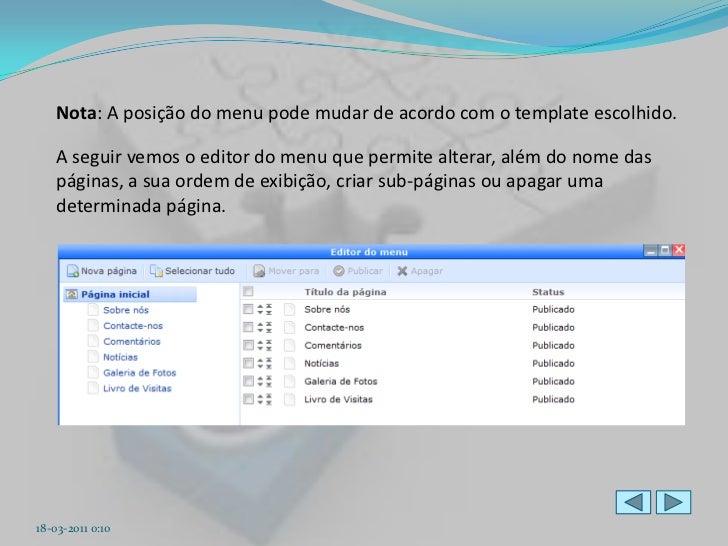 24. 24. Nota: A posição do menu pode mudar de acordo com o template escolhido. A seguir vemos o editor do menu que permite alterar, além do nome das páginas, a sua ordem de exibição, criar sub-páginas ou apagar uma determinada página.18-03-2011 0:10