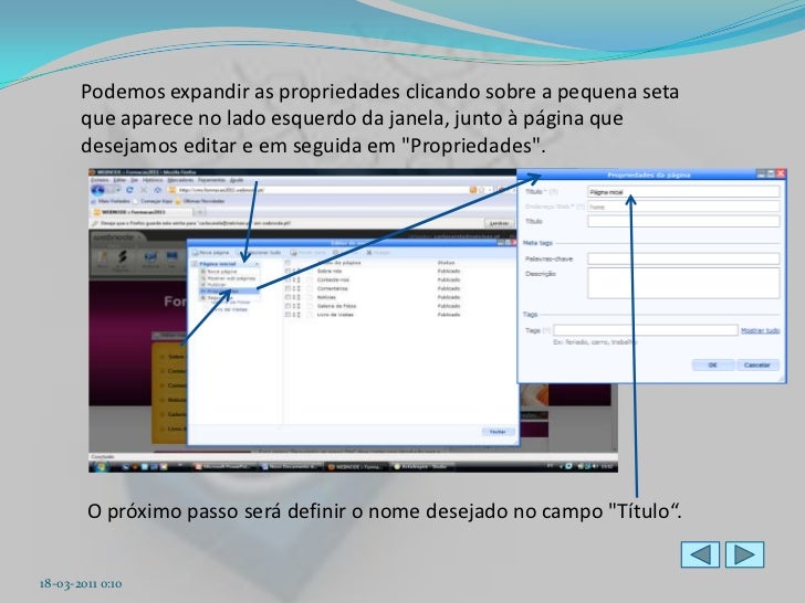 25. 25. Podemos expandir as propriedades clicando sobre a pequena seta que aparece no lado esquerdo da janela, junto à página que desejamos editar e em seguida em "Propriedades". O próximo passo será definir o nome desejado no campo "Título“.18-03-2011 0:10