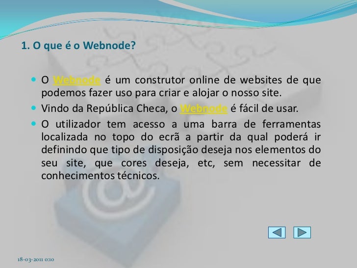 2. 2. 1. O que é o Webnode?  O Webnode é um construtor online de websites de que podemos fazer uso para criar e alojar o nosso site.  Vindo da República Checa, o Webnode é fácil de usar.  O utilizador tem acesso a uma barra de ferramentas localizada no topo do ecrã a partir da qual poderá ir definindo que tipo de disposição deseja nos elementos do seu site, que cores deseja, etc, sem necessitar de conhecimentos técnicos.18-03-2011 0:10