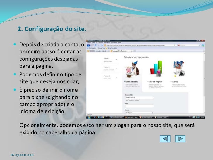 3. 3. 2. Configuração do site.  Depois de criada a conta, o primeiro passo é editar as configurações desejadas para a página.  Podemos definir o tipo de site que desejamos criar;  É preciso definir o nome para o site (digitando no campo apropriado) e o idioma de exibição. Opcionalmente, podemos escolher um slogan para o nosso site, que será exibido no cabeçalho da página.18-03-2011 0:10