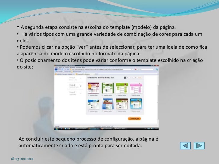 4. 4. • A segunda etapa consiste na escolha do template (modelo) da página. • Há vários tipos com uma grande variedade de combinação de cores para cada um deles. • Podemos clicar na opção “ver” antes de seleccionar, para ter uma ideia de como fica a aparência do modelo escolhido no formato da página. • O posicionamento dos itens pode variar conforme o template escolhido na criação do site; Ao concluir este pequeno processo de configuração, a página é automaticamente criada e está pronta para ser editada.18-03-2011 0:10