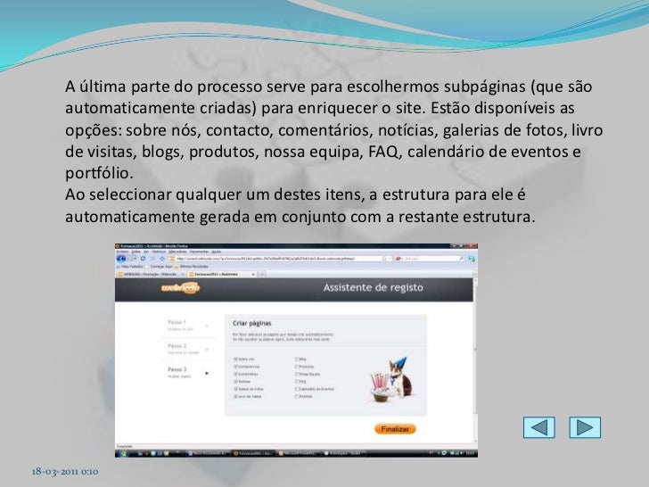 5. 5. A última parte do processo serve para escolhermos subpáginas (que são automaticamente criadas) para enriquecer o site. Estão disponíveis as opções: sobre nós, contacto, comentários, notícias, galerias de fotos, livro de visitas, blogs, produtos, nossa equipa, FAQ, calendário de eventos e portfólio. Ao seleccionar qualquer um destes itens, a estrutura para ele é automaticamente gerada em conjunto com a restante estrutura.18-03-2011 0:10