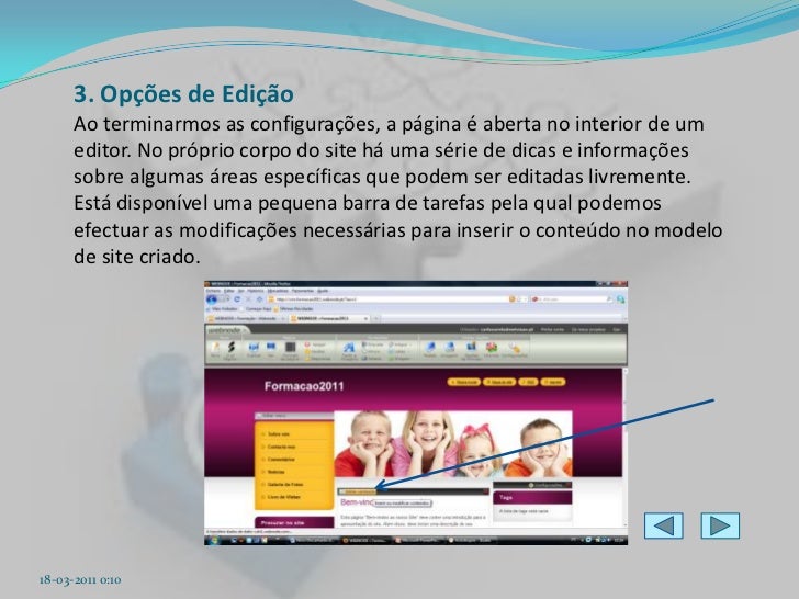 6. 6. 3. Opções de Edição Ao terminarmos as configurações, a página é aberta no interior de um editor. No próprio corpo do site há uma série de dicas e informações sobre algumas áreas específicas que podem ser editadas livremente. Está disponível uma pequena barra de tarefas pela qual podemos efectuar as modificações necessárias para inserir o conteúdo no modelo de site criado.18-03-2011 0:10