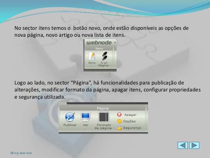7. 7. No sector itens temos o botão novo, onde estão disponíveis as opções de nova página, novo artigo ou nova lista de itens. Logo ao lado, no sector “Página”, há funcionalidades para publicação de alterações, modificar formato da página, apagar itens, configurar propriedades e segurança utilizada.18-03-2011 0:10