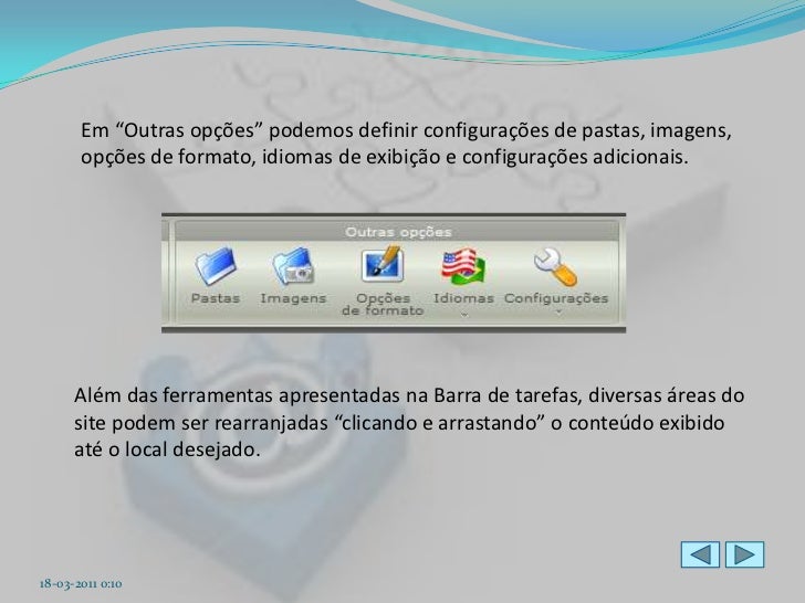 8. 8. Em “Outras opções” podemos definir configurações de pastas, imagens, opções de formato, idiomas de exibição e configurações adicionais. Além das ferramentas apresentadas na Barra de tarefas, diversas áreas do site podem ser rearranjadas “clicando e arrastando” o conteúdo exibido até o local desejado.18-03-2011 0:10