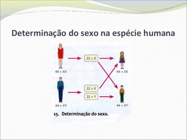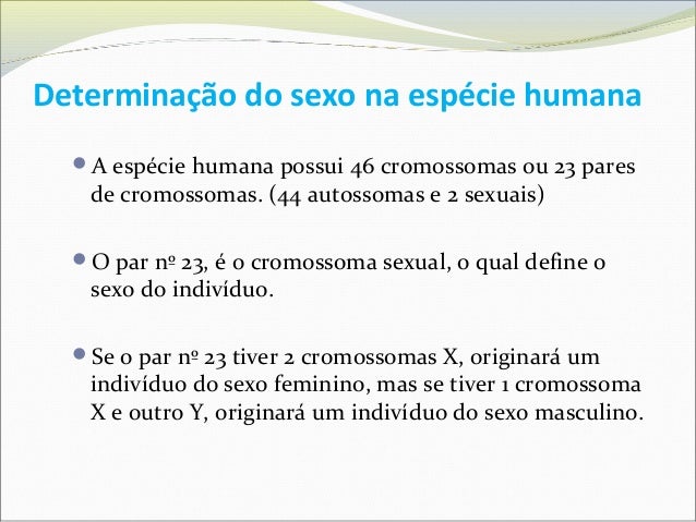 9. 9. Determinação do sexo na espécie humana A espécie humana possui 46 cromossomas ou 23 pares de cromossomas. (44 autossomas e 2 sexuais) O par nº 23, é o cromossoma sexual, o qual define o sexo do indivíduo. Se o par nº 23 tiver 2 cromossomas X, originará um indivíduo do sexo feminino, mas se tiver 1 cromossoma X e outro Y, originará um indivíduo do sexo masculino.
