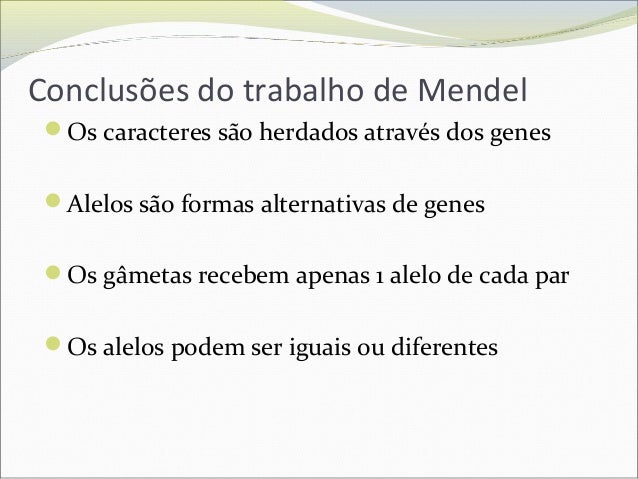 15. 15. Conclusões do trabalho de Mendel Os caracteres são herdados através dos genes Alelos são formas alternativas de genes Os gâmetas recebem apenas 1 alelo de cada par Os alelos podem ser iguais ou diferentes