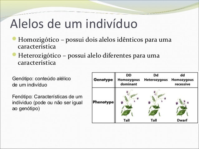 16. 16. Alelos de um indivíduoHomozigótico – possui dois alelos idênticos para uma característicaHeterozigótico – possui alelo diferentes para uma característicaGenótipo: conteúdo alélicode um indivíduoFenótipo: Características de umindíviduo (pode ou não ser igualao genótipo)