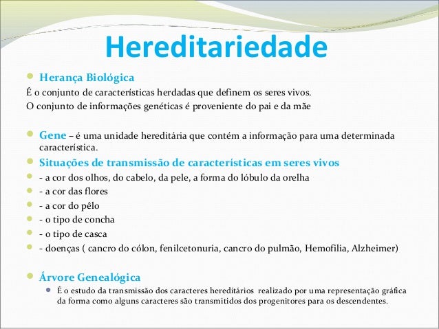 1. 1. Hereditariedade Herança BiológicaÉ o conjunto de características herdadas que definem os seres vivos.O conjunto de informações genéticas é proveniente do pai e da mãe Gene – é uma unidade hereditária que contém a informação para uma determinada característica. Situações de transmissão de características em seres vivos - a cor dos olhos, do cabelo, da pele, a forma do lóbulo da orelha - a cor das flores - a cor do pêlo - o tipo de concha - o tipo de casca - doenças ( cancro do cólon, fenilcetonuria, cancro do pulmão, Hemofilia, Alzheimer) Árvore Genealógica  É o estudo da transmissão dos caracteres hereditários realizado por uma representação gráfica da forma como alguns caracteres são transmitidos dos progenitores para os descendentes.